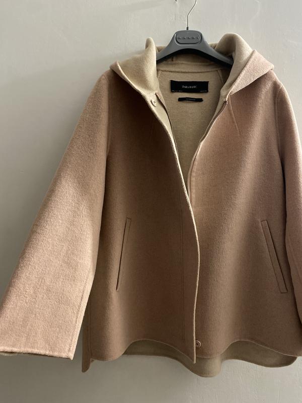 Пудрово рожеве вовняне пальто релакс фасону Zara Лінійка handmade, підвищеноі якості З лб’ємним та затишним капюшоном Двокольорове полотно ( зовні рожеве, зсередини- беж) На молніі ( і на двох кнопочках, зверху та знизу) Кишені по бокам( ще зашиті) ззаду трішечки довше Плечі зпущені Розмір десь на Л плюс мінус Довжина 69/75 ПоГ 60 Рукав від горловини 72