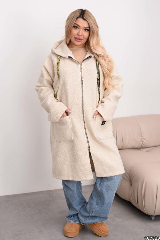 Пальто из качественной ткани букле в красивых батальных размерах. Цвета: бежевый, черный, шоколад, серый. Размер: 48-50, 52-54, 56-58, 60-62. Замеры готового изделия размер 48-50: ОГ - 126 см; ОС - 130 см; Длина рукава от капюшона - 77 см; Длина - 95 см; Замеры готового изделия размер 52-54: ОГ - 134 см; ОС - 138 см; Длина рукава от капюшона - 78 см; Длина - 96 см; Замеры готового изделия размер 56-58: ОГ - 142 см; ОС - 146 см; Длина рукава от капюшона - 79 см; Длина - 97 см; Замеры готового изделия размер 60-62: ОГ - 150 см; ОС - 154 см; Длина рукава от капюшона - 80 см; Длина - 98 см.