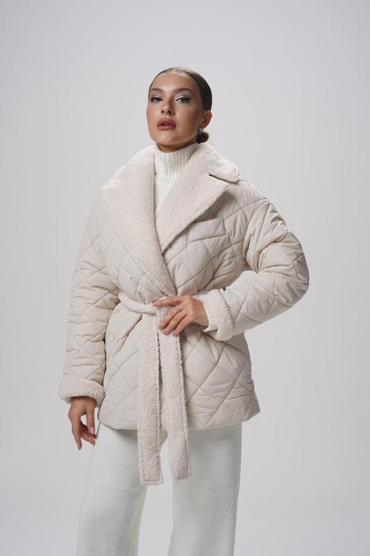 Теплое стеганое пальто с меховым воротником под овчину молочное, пальто на осень зима с по...