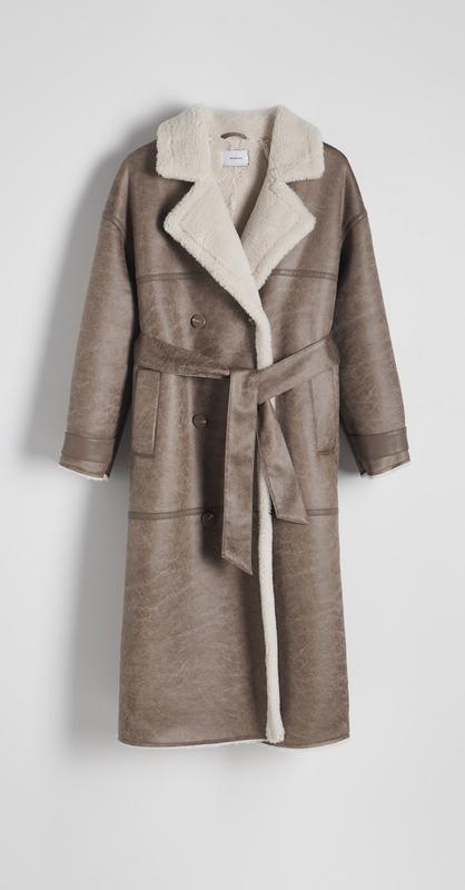 • висок відкладний комір • довгі прямі рукави з ремінцями • двобортна застібка на ґудзики • завʼязка на поясі • дві кишені з боків • штучна овеча підкладка всередині