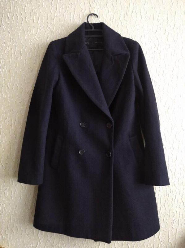 Темно-синее шерстяное двубортное женское пальто, р.S, 165/84 А, ZARA BASIC. Замеры на фото, 60% шерсть, 36% полиэстер, 4% другие материалы. Длина пальто 84 см ( фото прилагается).