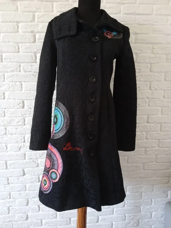 Элегантное черное испанское пальто Desigual размера 38 Ширина плечей 38 см. Обхват груди до середины 40 см Длина рукава 60 см Длина изделия 100 см Обхват талии до середины 38 см