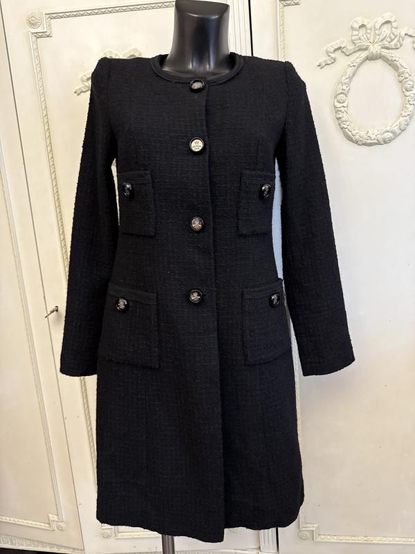 Колір чорний. Тканина таідова. Чудове легке пальто в стилі Шанель. Розкішні ґудзики, по два кармани :на груді та по бедра. Напівприьалений сілует. Дуже елегантне і допоговартісне. Склад:вовна/ Акріл/поліестер(34/38/23). Розмір по бірці-36. Заміри: довжина -92 см, ПОГ-43 см, ПОТ-39 см, ПОБ-47 см, рукав-60 см, ширина в плечах-36 см. На підкладці чорного кольору. Стан ідеальний.