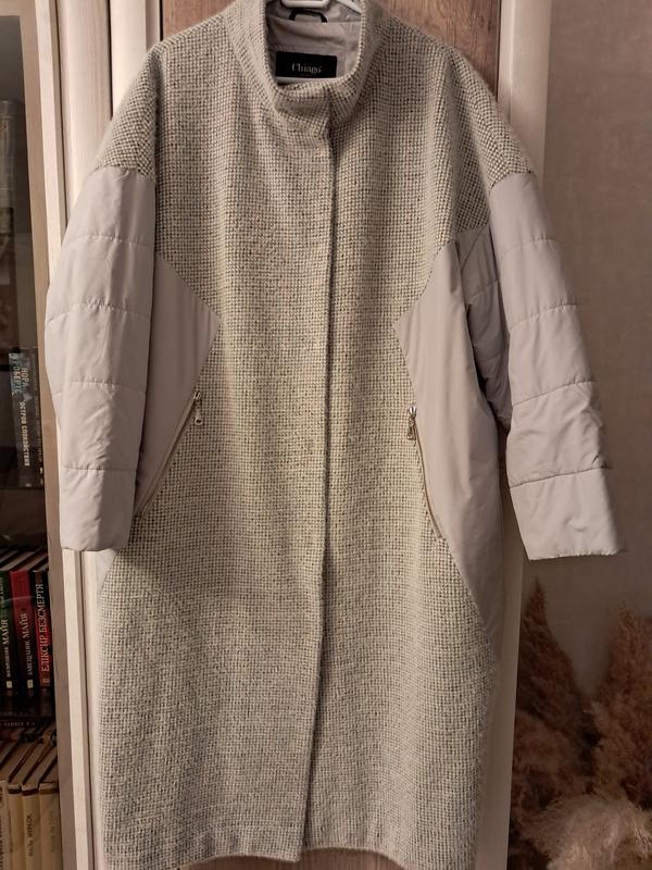 Стильное пальто светло-серого цвета 56-58 размера, комбинированное из двух тканей, мягкое. Верх 1 - 100% полиэстер, верх 2 - 60% полиэстер, 40% нейлон, подклад, наполнитель 100% полиэстер. Пальто легке, тепле, до -5. Стойка, низ рукавов на магнитах. Застежка на кнопках. Подклад стеганый. ПОГ 67, ПОТ 68, ПОС 68, длина рукава от горловины 76, длина 114.