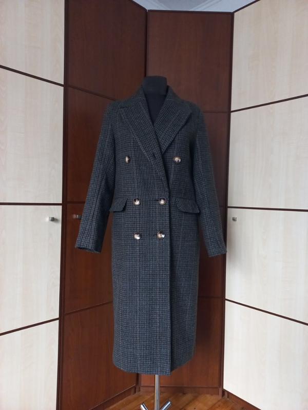 двубортное пальто с принтом гусиная лапка, имеет карманы и высокую шлицу. не утепленное, на подкладке. Длина 108 см, длина рукава 59 см, ширина плеч 41 см, ширина 48 см.