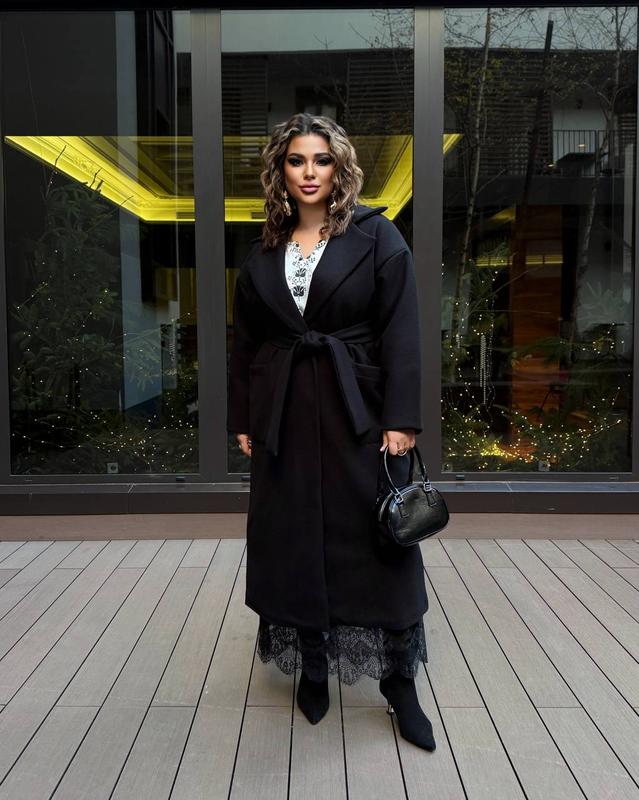 Кашемировое женское пальто с поясом больших размеров, черное