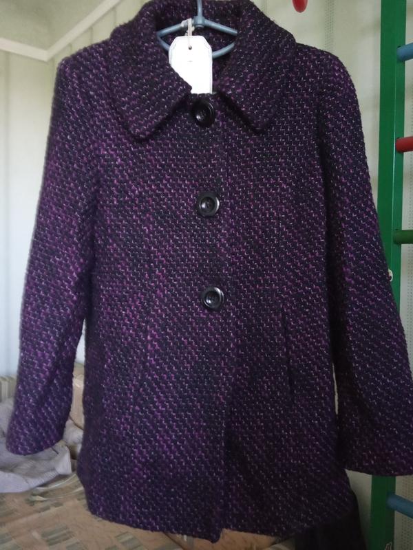 Полу-пальто из ткани букле фиолетово-бордового, чёрного цвета. Размер – 44, указан 12 (L )(на худенькую девушку). Новое – видно по подкладке. Длина 72 см. Длина плеча 10 см, длина рукава 57 см. ПОГ – 48 см, ПОТ – 46 см, ПО по низу 56 см. Прямого покроя. Присутствует потайной карман. Застёгивается на большие 3 пуговицы, внизу потайная кнопка. Продаю так как не подошёл размер.