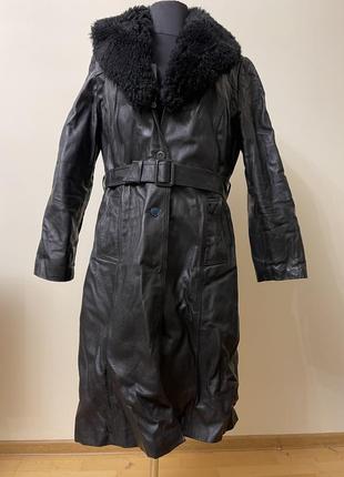Кожаное пальто с подстежкой (овчина). Плечи 44 см. ПОГ 54 см. ПОС 64 см. Длина 110 см. Кожа жесткая. Кожа в отличном состоянии. Подкладка ""подгуляла"", лучше поменять. Можно носить как плащ.
