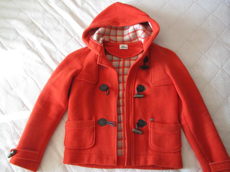 Фирменное теплое пальто с капюшоном Lacoste (Франция) оранжевого цвета, размер 36 (XS/S) Замеры: - длина спереди от ворота 51см - длина сзади без капюшона 57см - ширина спереди от подмышки до подмышки (это РЕГЛАН !) 45-46см - длина рукава от ворота (это РЕГЛАН !) 72см