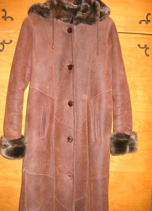 Дубленка с капюшоном,длинная,очень теплая,немножко затертые отвороты на рукавах,могу предложить и шапку за символическую цену в цвет дубленки!