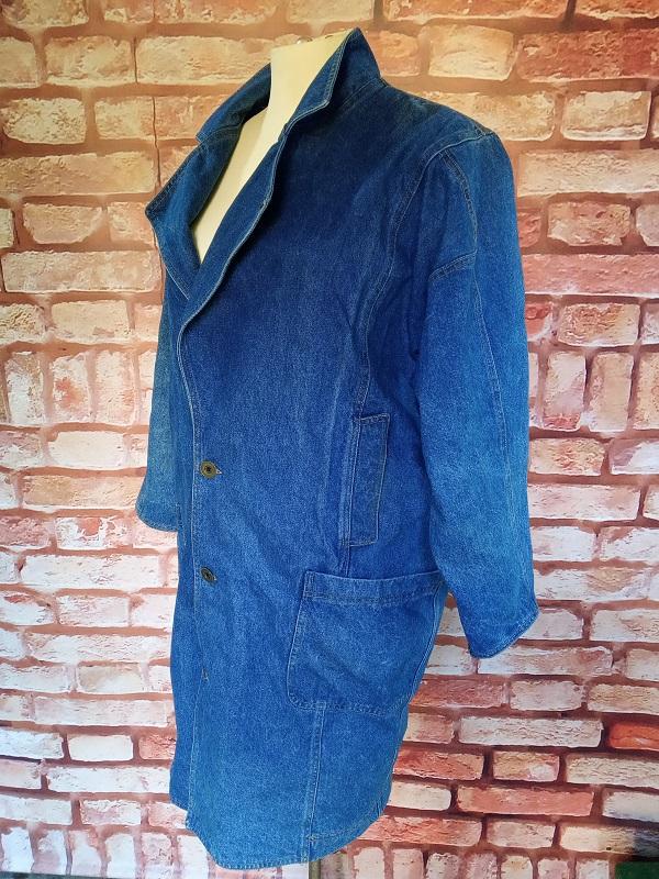 Коллекционный раритет! Пальто джинсовое винтажное рубеж 80-90х Ткань очень плотная. Без подкладки, имеются небольшие подплечики, крой широкий сверху и заужен к низу Замеры (см): плечи - 53, подмышки - 67, низ - 57, длина по спине (без воротника) - 109, рукав от плеча - 59 Состояние: хорошее, следы носки незначительные, небольшие естественные потертости, нюанс - абсолютно незначительный надрыв по шву около кармана и небольшое пятнышко на рукаве (два последних фото)