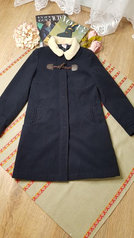 Стильное пальто в мелкий рубчик. Темно-синий, насыщенный цвет. Воротник из искусственной овчины. Все пальто на пуговичках - они скрыты планкой, вверху одна большая пуговица. По 2 кармана с каждой стороны, некоторые еще зашиты. Размер 12 (будет хорошо на XS, S). Состав: 81% полиэстер, 17% вискоза, 2% эластан. Бренд John Lewis. Состояние прекрасное. Замеры: Длина - 83 см Длина рукава - 59 см ПОГ - 42 см ПОТ - 43 см ПОБ - 48 см