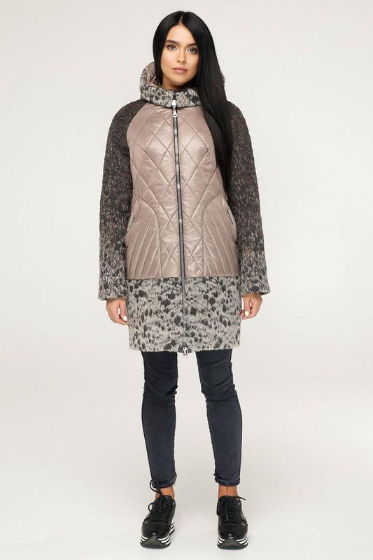 Пальто женское демисезонное, выполненное из двух видов ткани- пальтовой и плащевой, прямого силуэта с рукавами реглан. Капюшон- не съмный. Подкладка 100% нейлон, утепленная ватином. Плащевка- лаке, утепленная на силиконе Пальто декорировано стеганными деталями из лаке, кнопками, заклепками, металлическим украшением, тесьмой «молния» Карманы- в шве, на потайную тесьму «молния» и накладные Застежка на тесьму «молния» Длина рукава 65 см Длина изделия по спинке 85 см Состав ткани: 80%-Шерсть 20%-Полиэстер (1145)