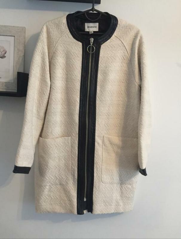 Лёгкое белое пальто Stradivarius, в идеальном состоянии, надевала пару раз всего, сидит просто отлично :) Спереди два больших кармана, кожаные чёрные вставки на рукавах, горловине и вдоль молнии, подкладка тоже чёрная. Длина 77 см ПОГ 51 см ПОТ 52 см ПОБ 53 см Рукав от горловины 69 см Состав: 100% котон Подкладка 100% полиэстер Отвечу на все вопросы
