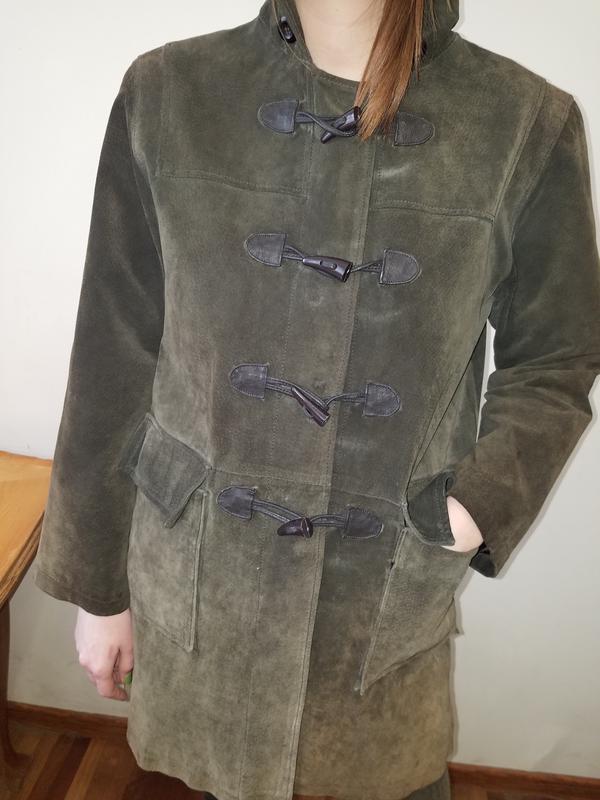пальто замша р.38 подстежка теплая стеганная на весну.есть дефект пару капель на левом рукаве.на последнем фото.идеальное состояние