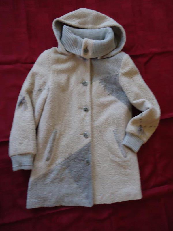 Пальто букле,молочного цвета ,съемный капюшон ,ПОГ 52,длина 80,рукав 62 ,ньюанс на последнем фото -потертость подкладки