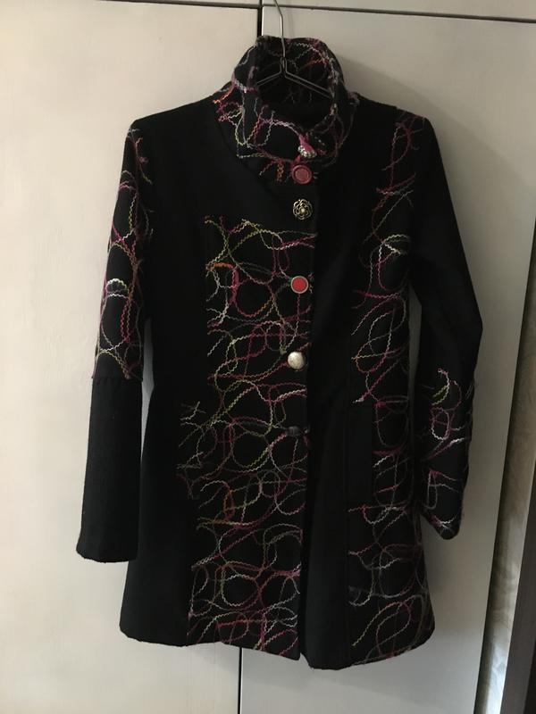 Итальянское шерстяное пальто, очень красивое, яркое, необычное. Воротник стойка - 9 см., плечо - 11 см, рукав -61см., длина по спине 86 см., по груди 44 см., пою 48см., по спине 35 см, внутренние карманы, пальто чёрного цвета, украшено цветной вышивкой