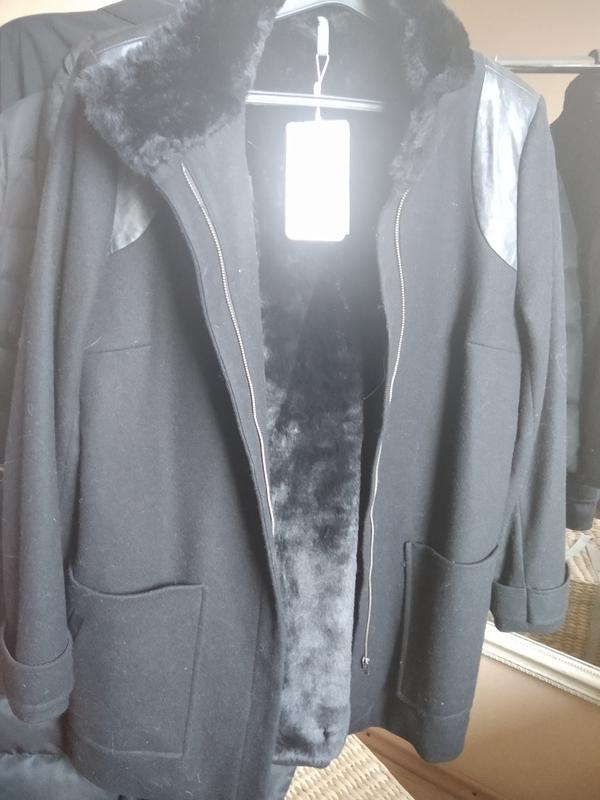 80℅ шерсть , подкладка-иск. мех, молния, карманы, ворот-стойка, дл. 78см, рукав- 63 Naf-Naf чёрное кожаные вставки на плечах ,,полезли,,