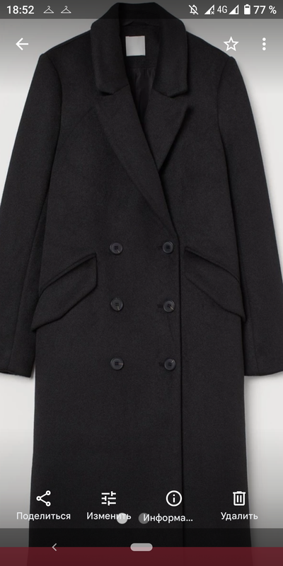 Шикарное двубортное пальто, стиль кежуал, черного цвета, прямой фасон, состав ткани 95 % полиестер, 5%шерсть, с карманами клапанами, длина пальто 111, длина рукава 61, Ог 55, от56, об 57, плечи 39. Теплая зима до - 5, осень, весна. Цена 60 евро. Заказывала на сайте H&M.