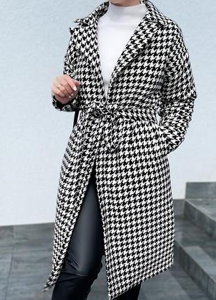 Пальто арт. ha. 405 Тканина: пальтовый твід "гусяча лапка", наповнювач силікон 80, підклад поліестер Розмір: 42-44, 46-48, 50-52 Колір: чорна лапка, бежева лапка, темно - шоколадна лапка Пальто на запах, з поясом, кишені в бічних швах