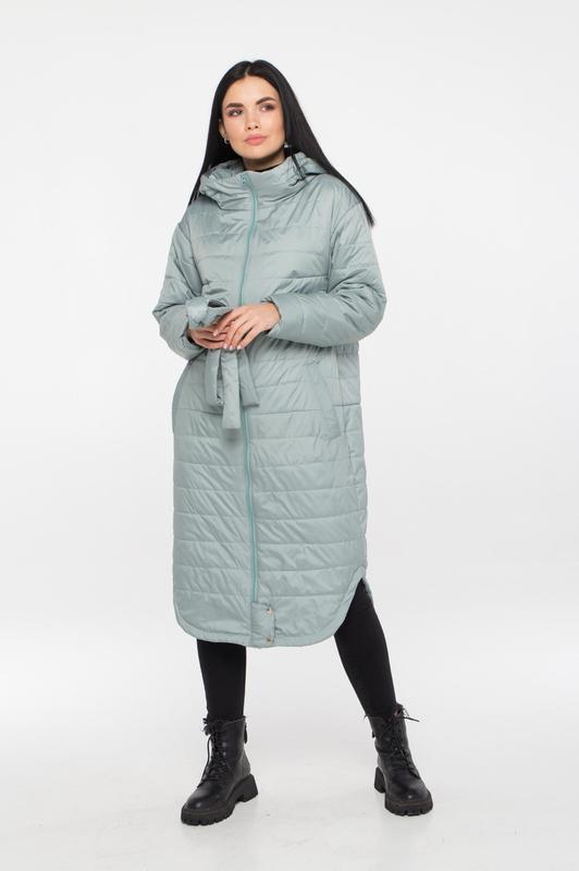 Светло-зеленое стеганое пальто из плащевки с капюшоном и поясом на весну-осень размер 42-5...