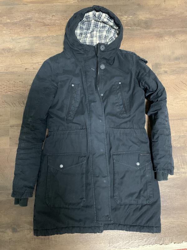 Дуже тепла парка темно-синього кольору Брендована ґудзиками, надписом на плечі, шкіряною біркою Пог53 Пот 48 Поб 57, по спинці 87, плечі 41, рукав 64 плюс манжета трикотажна, що огортає кисть руки.