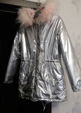 Куртка парка срібляста. Зима. Хутро штучне на каптурі- відстібається рожеве. Розмір М. Загалом парка в ідеальному стані. З недоліків - відстали пара кнопок. Можна відремонтувати.