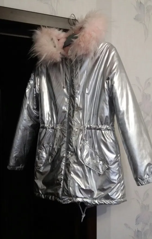 Куртка парка серебристая. Зима. Мех искусственный на капюшоне-отстегивается розовое. Размер М. Всего парка в идеальном состоянии. Из недостатков - отстали пара кнопок. Можно отремонтировать.