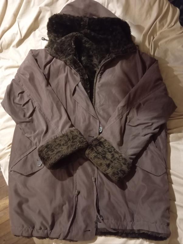 парка зима, двусторонний, капюшон кармана, кулиска цвет темный мокко, искусственный мех, есть небольшой Сенанс следует подшить снизу молнию