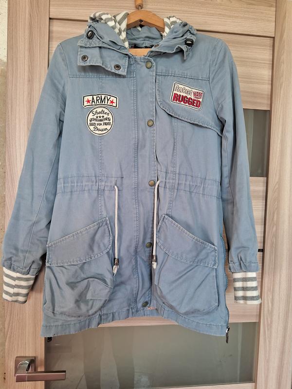 Длина 76см.Ширина 47см в поясе можно стягивать шнурками.Рукав 64см.Две карманы.Капишон отстегивается.Куртка на замке и на кнопках