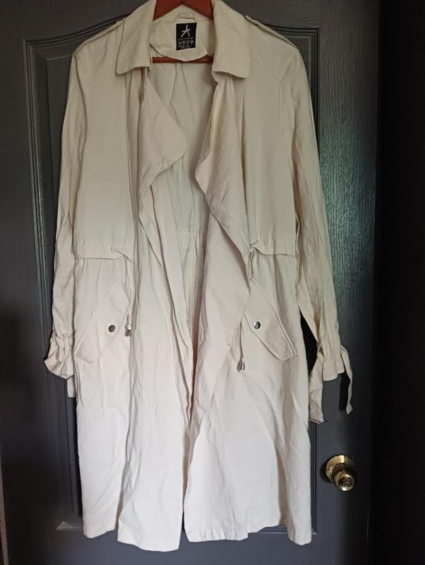 Бежевая лёгкая парка без подкладки с шлицей сзади и шлевками на руковах. Ширина талии регулируется шнурком на поясе. Сделана из вискозы. Очень приятная к телу и прекрасно подходит для теплых осенних дней.
