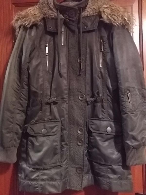 Парка. Lee Cooper. Размер по бирке L. Подойдет M-L. Темно-зеленый цвет, ткань с отливом. Подкладка тонкая с небольшим утеплителем. Капюшон не отстегивается, но растегивается как воротник. Мнх искусственный. В очень хорошем состоянии. Недостатки: небольшие затяжки есть на подкладке (на фото с внутренней биркой видно); на правом кармане два малюсеньких пятнышка как от розового лака (их вообще не видно, но они есть, фото со вспышкой кармана). Ширина на уровне подмышек (внутри) 55 см Длина рукава от плечевого шва 69 см Повна ширина внизу 122 см Длина от плечевого шва 81 см Объем груди 105 см (меряла внутри)