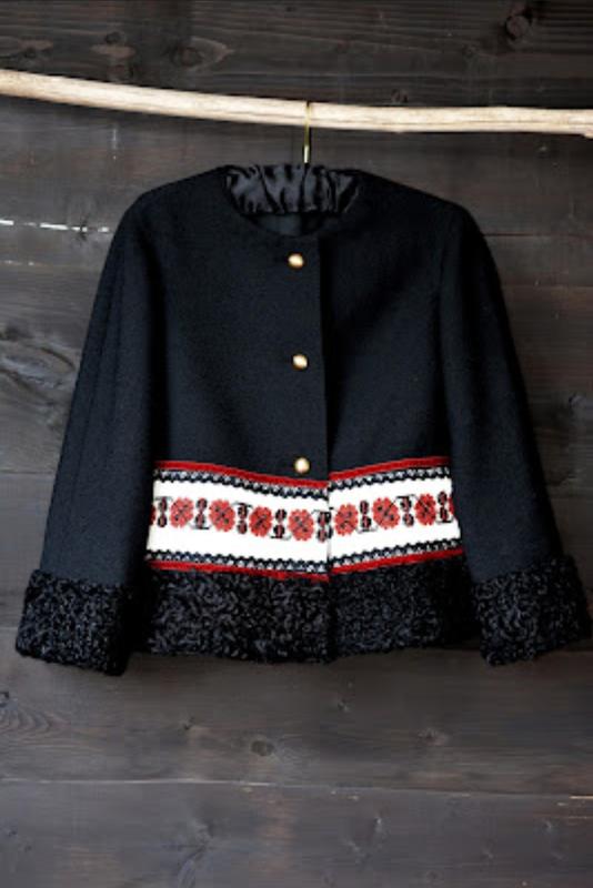 Кафтан в едином экземпляре, сшит из буклированной шерсти и украшен ручной вышивкой, бархатной лентой, хлопковым кружом и натуральным каракулем. Длина 60см, рукав 56см, спинка42см, По грудей 52см, по ниизу 61см