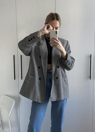 Двобортний жакет в клітинку Розмір оверсайз (довжина 74 см, ширина 56 см, рукав 59 см) Склад: 70% поліестер, 30% шерсть
