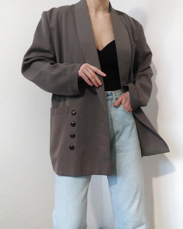 Винтажный двубортный пиджак в цвете мокко. Пиджак прямого кроя. Без надплечников, есть подкладка. Бирки отсутствуют. На ощущение шерсти с вкраплениями. Стан - идеальный. Размер L, на меньшие размеры S-M в виде оверсайза (одето на s). Замеры: плечи - 48 см, рукав - 61 см, ПОГ - 56 см, длина - 76 см. Отправка после 100% ПЕРЕДОПЛАТЫ По Новой почте Укр-почтой. Возвращение обмена отсутствует.