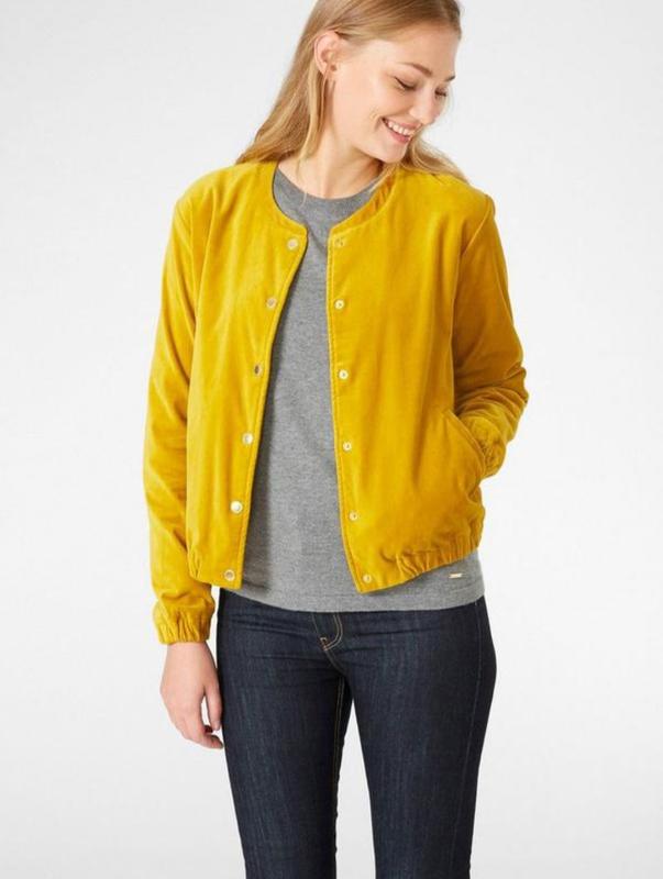 Оригинальный велюровый бомбер Holly&Whyte by Lindex, красивого горчично-желтого цвета (максимально приближенный цвет на фото 1-4). Модель из мягкого хлопка с бархатной отделкой, золотые брендированые кнопки, круглый вырез с переплетом, эластичная резинка по низу и по краям рукавов, два кармана впереди. Размер М. Замеры по запросу. Состав: 98% хлопок 2% эластан Состояние идеальное