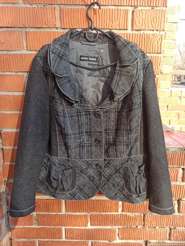 Шикарный теплый пиджак, жакет Gerry Weber 100% шерсть. Легкий и комфортный. Мерки: плечи 43 см, длина рукава 60 см, ПОГ-59см, ПОТ 50 см, ПОБ-57см, длина 61см, состав-100% шерсть.