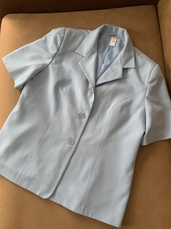 Жакет в новом состоянии, цвет голубой, состав на фото. Длина 71, ширина в плечах 45, ширина подмышками 55, пот 53.
