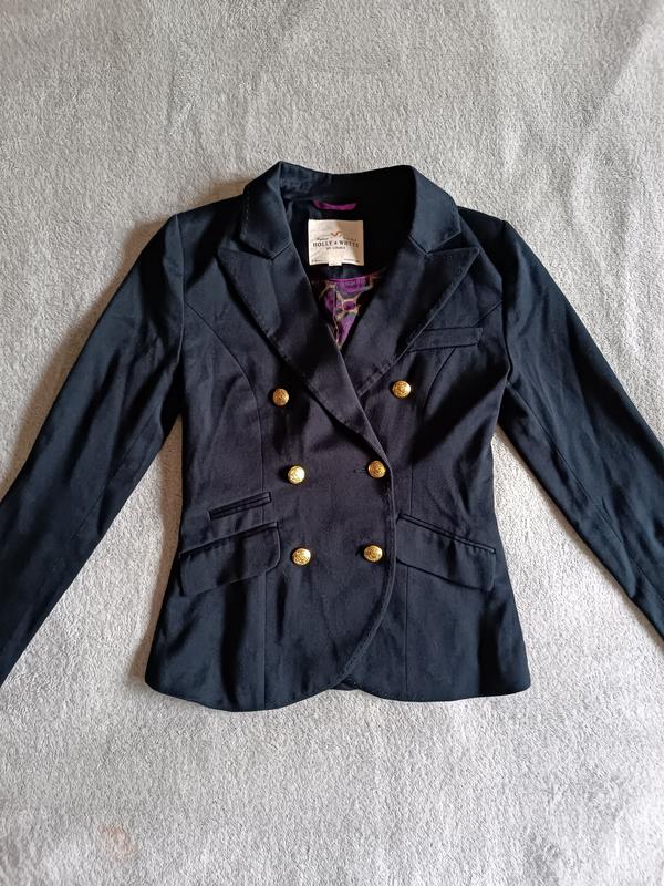 Новый классический двубортный жакет пиджак с золотыми пуговицами, очень красивой подкладкой. На спине две шлицы - они еще зашиты. Такие пиджаки продают по 2000 грн. Я освобождаю место в шкафу.