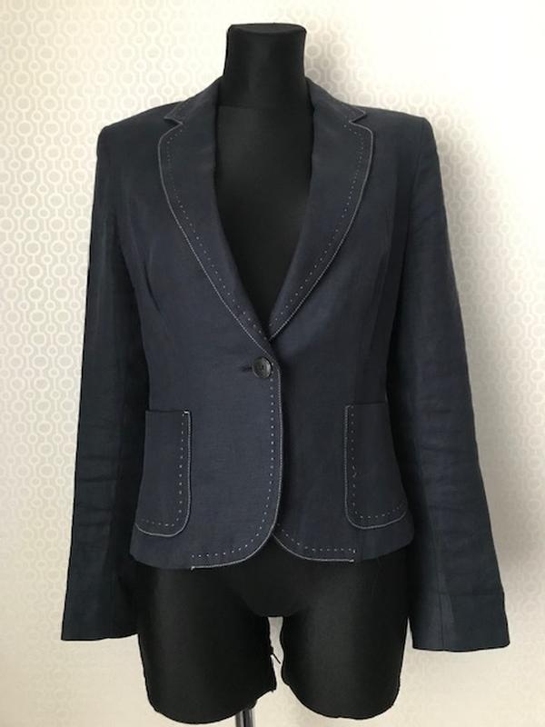 Элегантный жакет / пиджак темно-синего цвета из плотного льна (хорошо держит форму) от люкс бренда. Английский воротник. Застёгивается на одну пуговицу. Впереди ниже линии талии два накладных кармана. Изюминка жакета - контрастная белая отстрочка (скорее всего, ручная) по краю воротника, карманам и низу полочек. Без подкладки. Замеры изделия в не растянутом виде (не тянется), см: плечи 39, подмышки (примерно равно ПОГ) 48, ПОТ 40, ПОБ (по краю изделия) 48, длина 60, длина рукава 63. Объёмы манекена, см : плечи 39, ОГ 87, ОТ 63 ОБ 90 Отправляю Новой почтой либо наложенным платежом (при условии оплаты доставки в оба конца), либо по предоплате на карту Приват, Укрпочтой по предоплате, JUSTIN по предоплате Продаю много фирменных вещей Airfield, Strenesse, Gerry Weber, Steilmann, Brax, Bonita, Basler, Frank Walder, Apanage, Olsen, Ulla Popken, Gardeur, Monari, Rabe, Guess, Hauber, Marks&Spencer, Concept K. Много новых вещей (с этикеткой) - можно на подарок. Смотрите другие мои объявления. Спасибо, что заглянули :-)