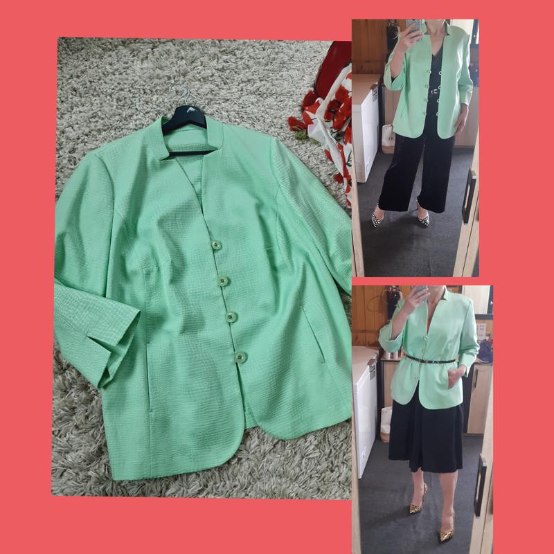 Шикарный пиджак в очень красивом цвете мята, ткань структурная, рукав 3/4. Бирочки все срезаны, размер примерно 18-20, на фото на 12 и рост 170. Замеры плечи 45 Рукав 50 ПОГ 64 ПОТ 60 ПОБ 65 ДЛИНА 72