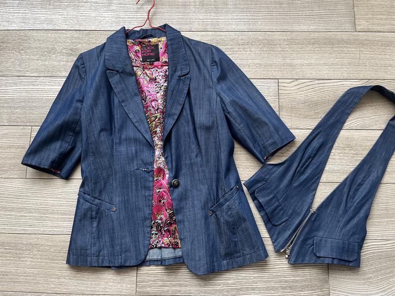 Очень классный пиджак, коттон, мягкий, идет в комплекте с оригинальным жилетом, который можно надевать как под пиджак, так и поверх него, что смотрится очень интересно и необычно. Классное качество, яркий подклад На размер М, можно S. Интересуйся, сложи замеры, кому нужно. Состояние отлично