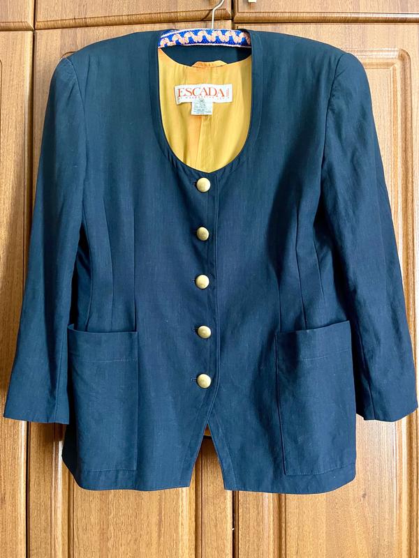 Розкішний вінтажний жакет з золотими ґудзиками від люкс бренду Escada by Margaretha Ley,оригінал Насичений темно-синій колір navy на насичено жовтому підкладі(камера засвічує) Є підплечники,ґудзики важкі металеві Розмір німецький 42