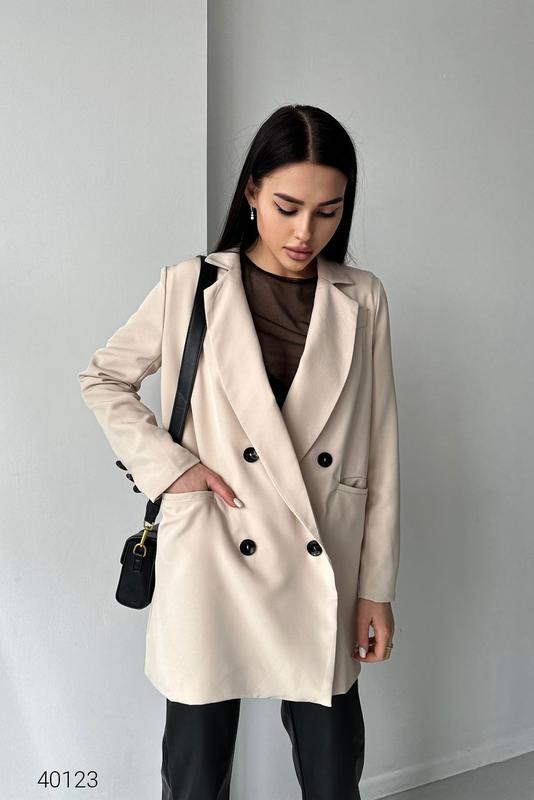 Удлиненный блейзер с двубортным дизайном. Лацканы с разрезами, подплечники, рукава с декоративной планкой. Нагрудный ложный карман, прорезные боковые карманы, планка на пуговицах, есть подкладка.