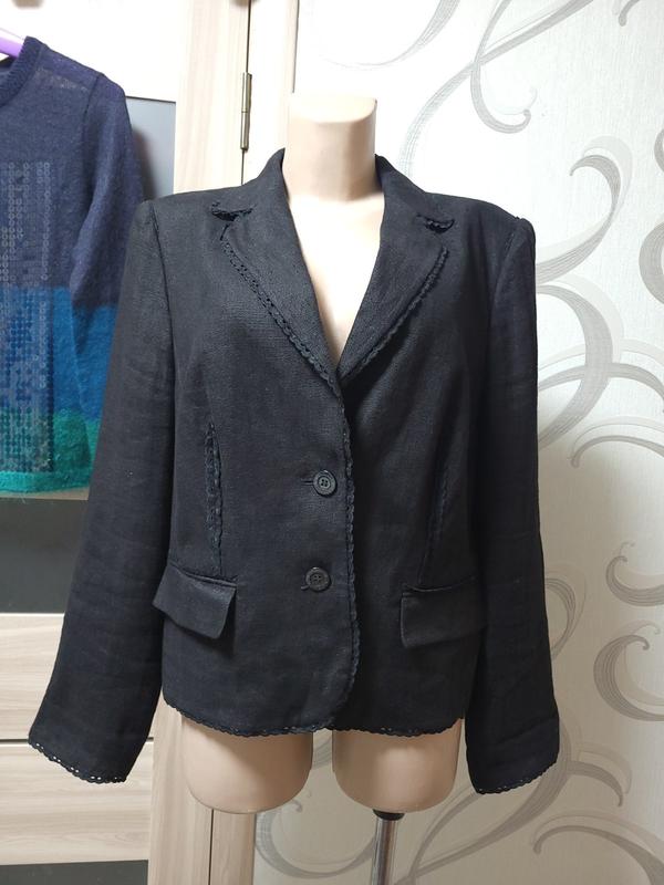 Пиджак в идеальном состоянии. Размер L. Ткань 100% лен. Фурнитура брендированная. Цвет черный. ПОГ 55см ПОТ 50см ПОБ 55см Плечи 42см Длина 64см Длина рукава 63см