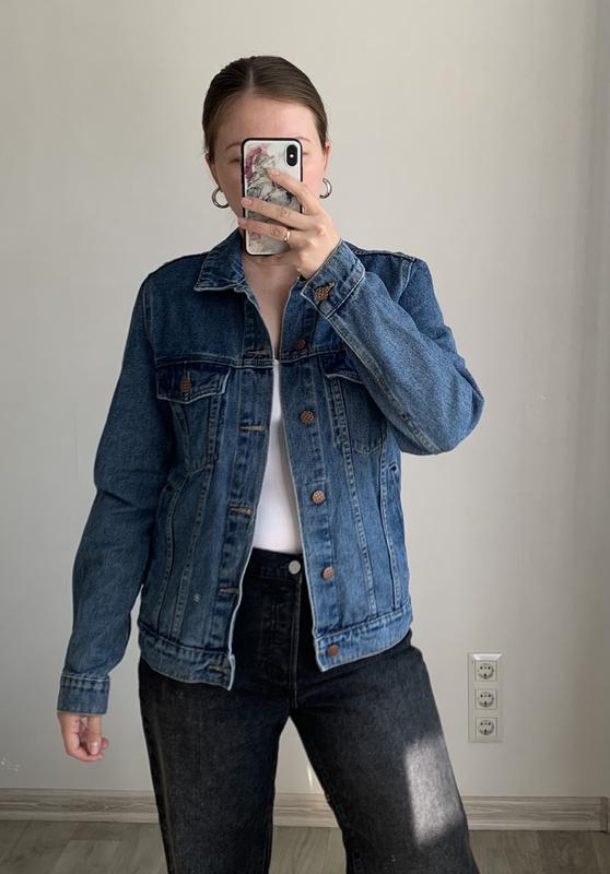 Джинсовка синього кольору Розмір М Виконана з цупкого деніму Довжина 65 см, довжина рукава 66 см, напівобхват грудей 48 см Стан ідеал Вдягнуто на розмір Л