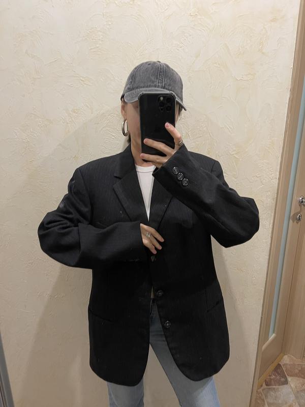 Плотный теплый пиджак Мужской, в составе много шерсти Прям такой чуточку колется) Но благо там есть подкладка потому колется только снаружи Теплый! Темно-серый, практически черный в такую приятную полоску Стан супер, винтажный 450₴