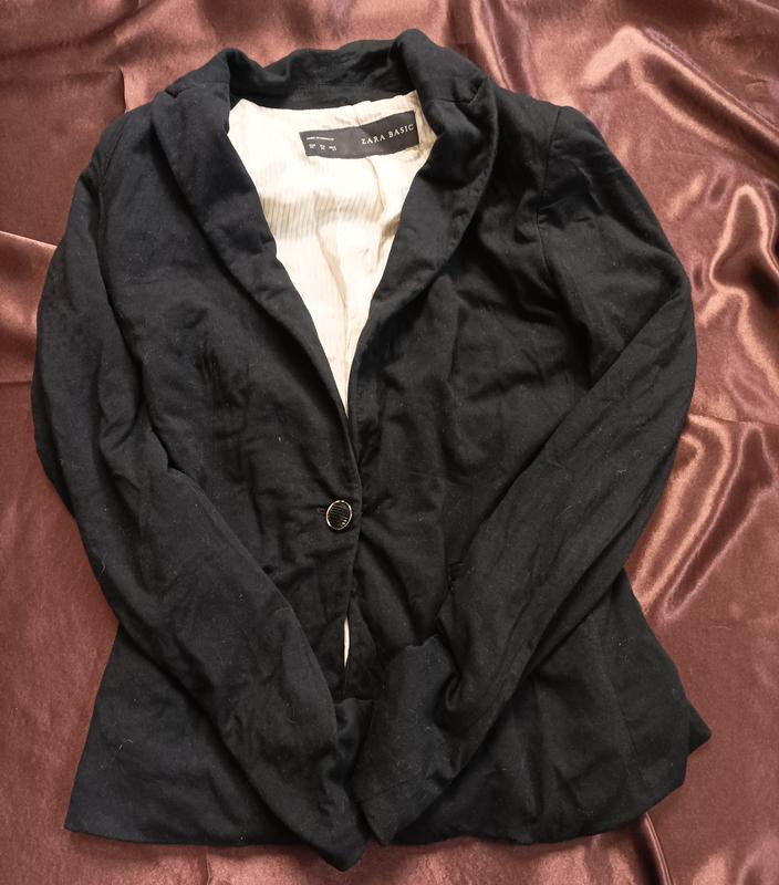 Черный пиджак Zara Basic Размер s-m состояние удовлетворительное, дефекты на фото – дырочки с внутренней стороны