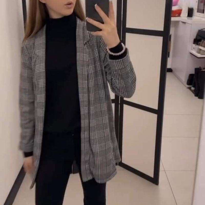 Пиджак серый в клетку удлиненный классика клетчатый длинный жакет
