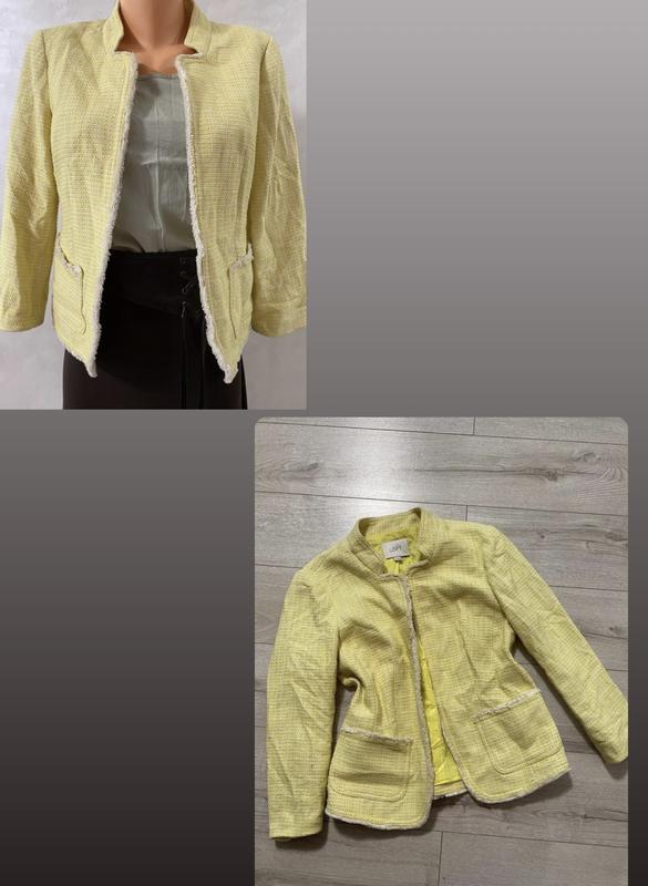 Застёжек нет,рукава трёхчетвертные,материал типу как на вещах Шанель,есть подкладка,снизу два кармана) Из нюансов-не глаженый)(гладить можно) Длина 54,5 см) Плечи 38,5 см) Пог 44 см) Пот 41 см) Снизу 45 см) Рукав 50 см) Продається як є без повернення